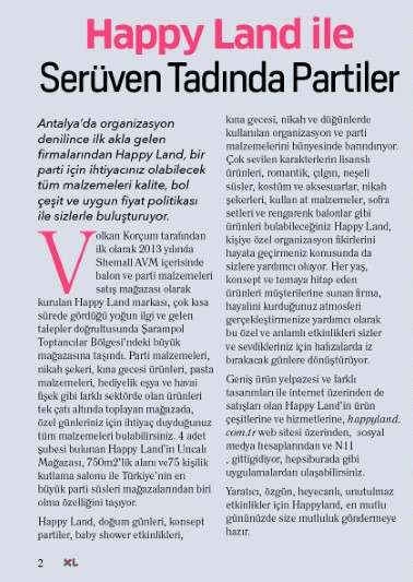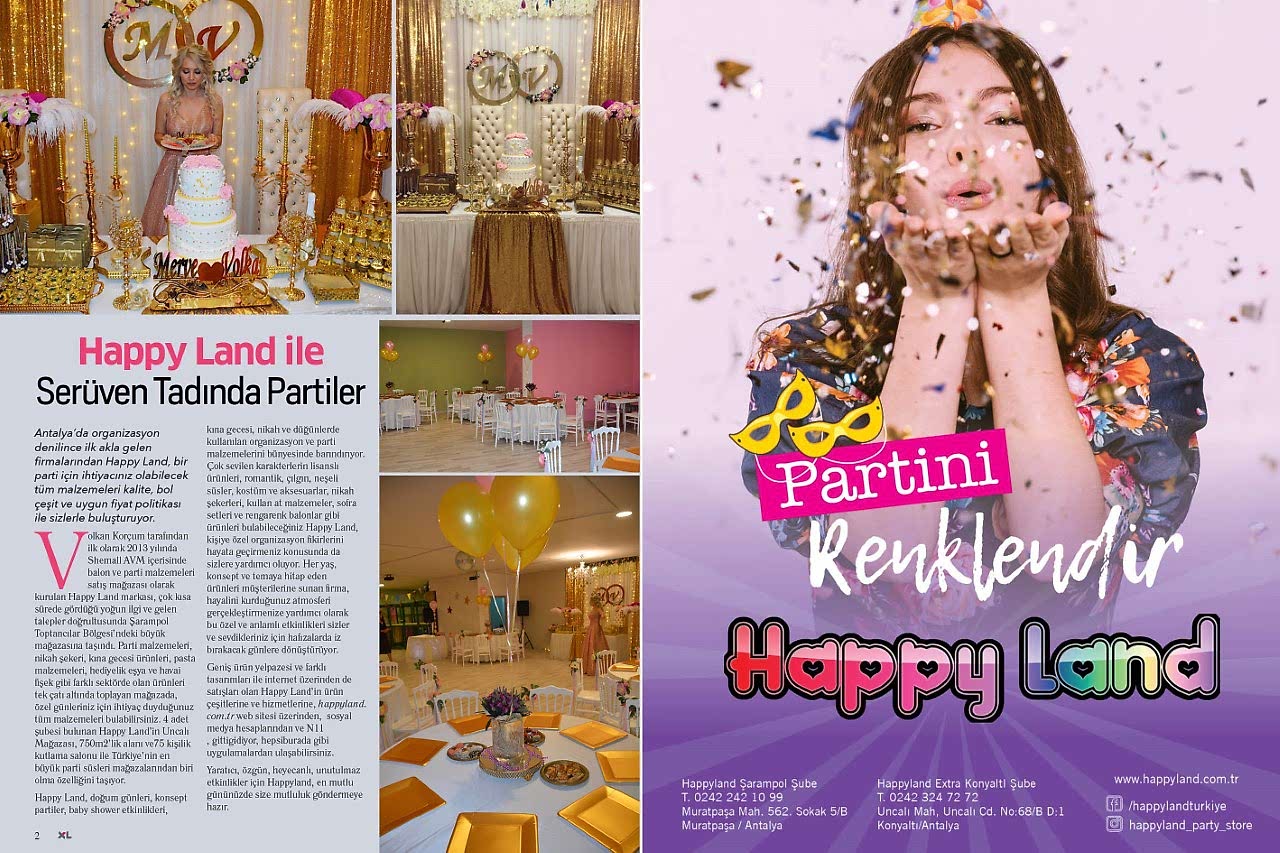 Antalya'da Organizasyon denilince ilk akla gelen firmalarından Happyland bir parti için ihtiyacınız olabilecek tüm malzemeleri kaliteli,bol çeşit ve uygun fiyat politikasıyla sizlerle buluşturuyor. İlk olarak 2013 yılında Shemall AVM içerisinde balon ve parti malzemeleri satış mağazası olarak kurulan Happy Land markası, çok kısa sürede gördüğü yoğun ilgi ve gelen talepler doğrultusunda Şarampol Toptancılar Bölgesi'ndeki büyük mağazasına taşındı. Parti malzemeleri, nikah şekeri, kına gecesi ürünleri, pasta malzemeleri, hediyelik eşya ve havai fişek gibi farklı sektörde olan ürünleri tek çatı altında toplayan mağazada, özel günleriniz için ihtiyaç duyduğunuz tüm malzemeleri bulabilirsiniz. 4 adet şubesi bulunan Happy Land'ın Uncalı Mağazası 750m2'lik alanı ve 75 kişilik kullanma salonu ile Türkiye'nin en büyük parti süsleri mağazalarından biri olma özelliğini taşıyor.Happyl Land doğum günleri, konsept partiler, baby shower etkinlikleri, kına gecesi, nikah ve düğünlerde kullanılan organizasyon ve parti malzemelerini bünyesinde barındırıyor. Çok sevilen karakterlerin lisanslı ürünleri, romantik, çılgın, neşeli süsler, kostüm ve aksesuarlar, nikah şekerleri, kullan at malzemeler, sofra setleri ve rengarenk balonlar gibi ürünleri bulabileceğiniz Happy Land kişiye özel organizasyon fikirlerini hayata geçirmeniz konusunda da sizlere yardımcı oluyor.Her yaş konsept ve temaya hitap eden ürünleri müşterilerine sunan firma, hayalini kurduğunuz atmosferi gerçekleştirmenize yardımcı olmak bu özel ve anlamlı etkinlikleri sizler ve sevdikleriniz için hafızalarda iz bıracak günlere dönüştürüyor. Geniş ürün yelpazesi ve farklı tasarımları ile internet üzerinden de satışları olan Happy Land'ın ürün çeşitlerine ve hizmetlerinede sitemizden,diğer e-ticaret mağazalarımızdan ulaşabilirsiniz. Yaratıcı, özgün, heyecanlı, unutulmaz etkinlikler için Happy Land en mutlu gününüzde sizlere mutluluk göndermeye hazır. |